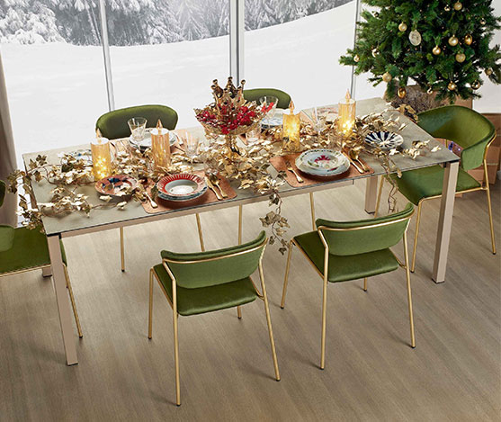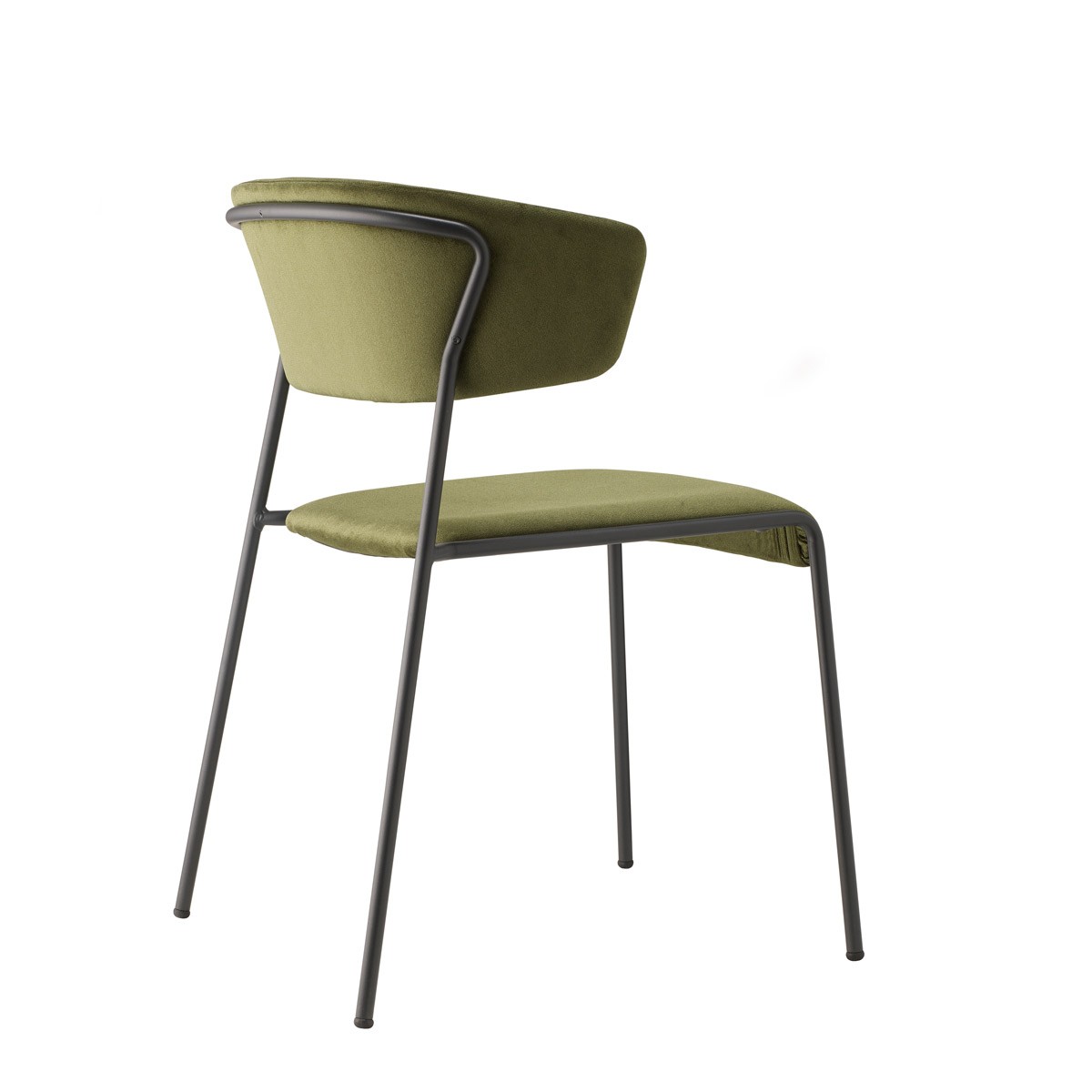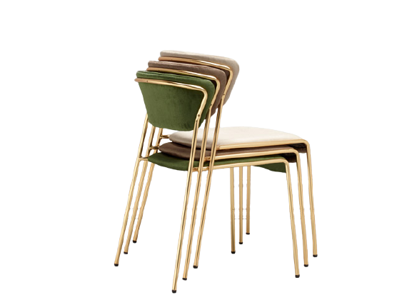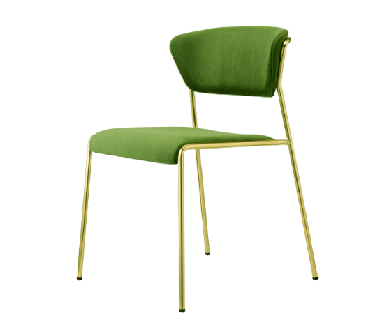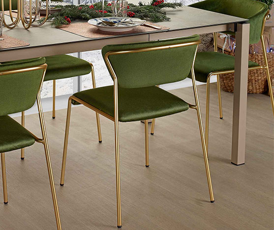 fr : La chaise Lisa avec accoudoirs. Les chaises Lisa sont inspirées des atmosphères élégantes des intérieurs des années 50 et 60. Le châssis tubulaire émincé contourne et soutient le dossier des chaises, avec assise rembourrée, assis et dossiers en velours vert, structure à 4 pieds en tube d’acier ø 16 mm en finition laiton. Chaise Lisa s’adapte aussi bien aux projets d’aménagement clé en main que dans les ambiances domestiques. en: The Lisa chairs are inspired by the elegant interiors of the 1950’s and 60’s. The slimline tubular structure envelops and supports the backrest of both the chairs featuring a padded with padded seat, green velvet seat and backs, 4-legged structure in ø 16 steel tube mm in brass finish.Lisa fits effortlessly into any contract or household setting thanks to the use of sophisticated finishes and materials.