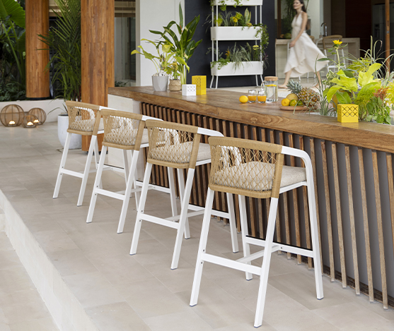 tabouret amber, structure blanche, corde blanche chaude de 3,5 mm et coussin d’assise (gris byron)