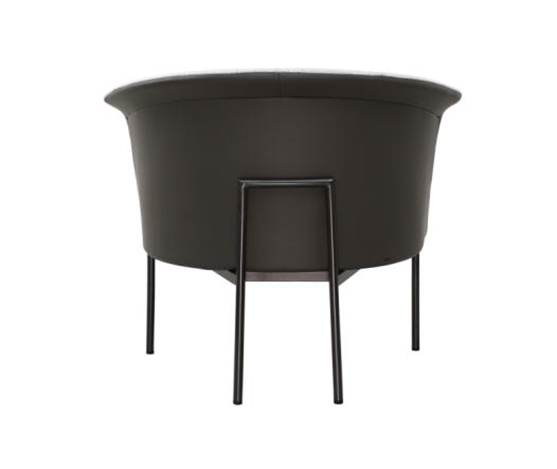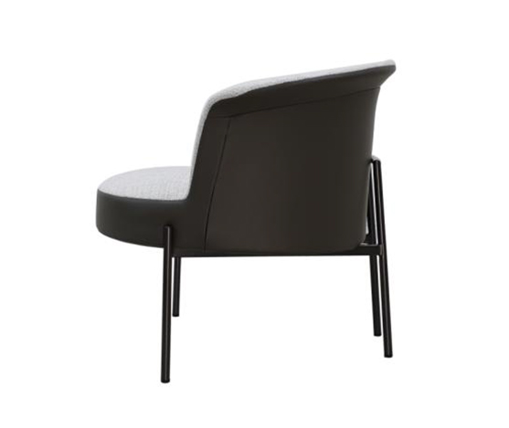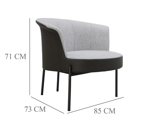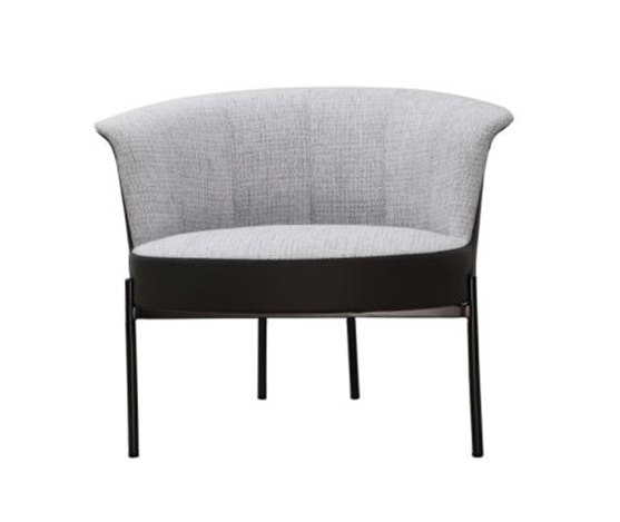 Fauteuil en tissu gris avec tissu en similicuir, piètement en métal noir.