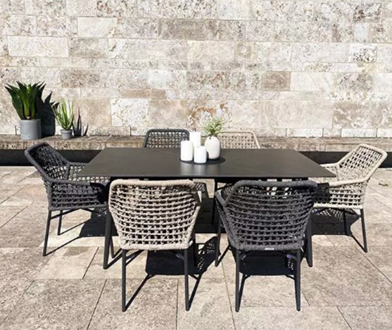 Le fauteuil empilable moderne FARO ROPE impressionne par son tressage caractéristique en forme de filet et son design sophistiqué. La corde d’environ 5 mm d’épaisseur est en fibre synthétique résistante aux UV, agréable au toucher et facile à nettoyer. Le siège est recouvert de tissu synthétique. Nous vous recommandons d’utiliser un coussin de siège. La chaise empilable est conçue pour le vent et les intempéries et est donc très durable. Jusqu’à quatre fauteuils peuvent être empilés les uns sur les autres pour économiser de l’espace. couleur beige structure white. structure aluminium blanche avec corde miel assise fontelina.