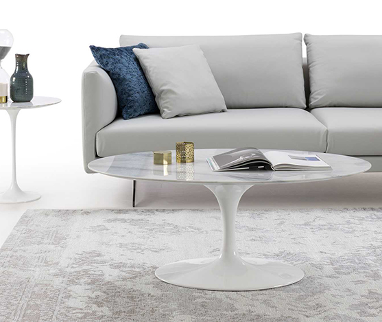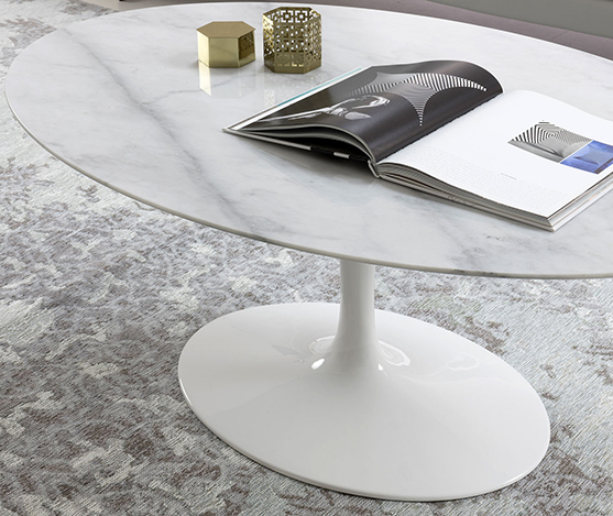 Table basse plateau en marbre et piètement aluminium blanc.