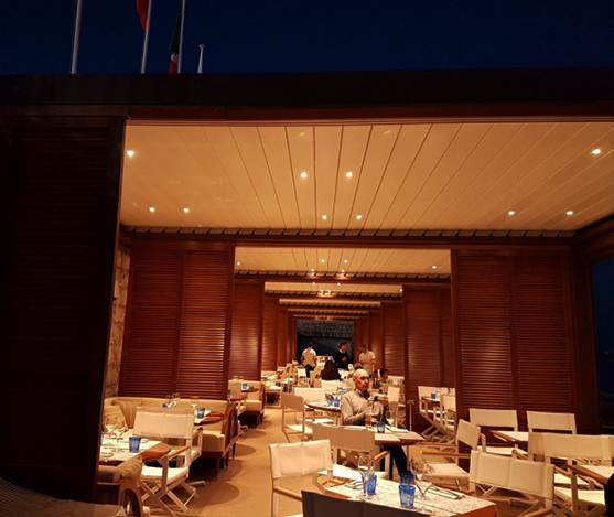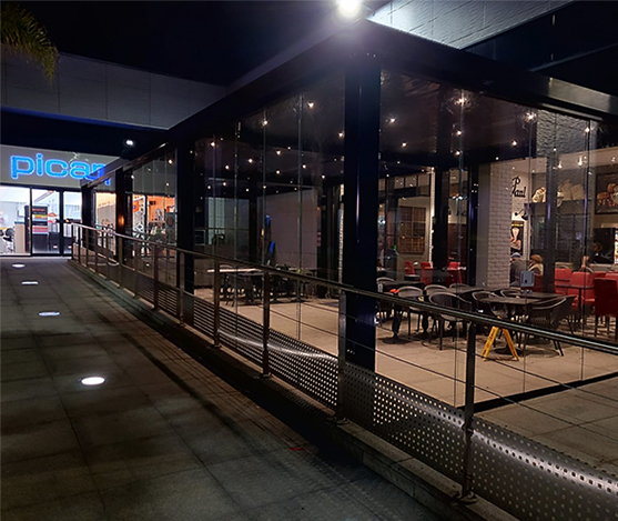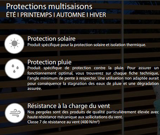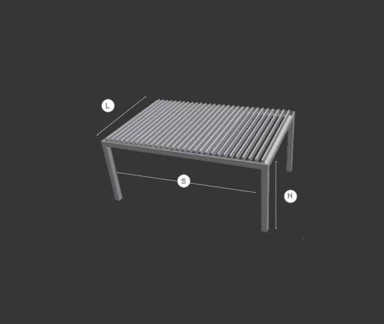 Gamme Pro Module simple S 6m Avec gouttière périmétrique double peau Lame double peau isolante > 1 moteur linéaire > 4 poteaux Module simple S 8m renforcé Avec gouttière périmétrique double peau Lame double peau et isolante > 2 moteurs linéaires > 6 poteaux Eclairgage: Spot led intégré dans les lames Fermetures latérales et frontales: Store zip, brise soleil fixe & i-glass