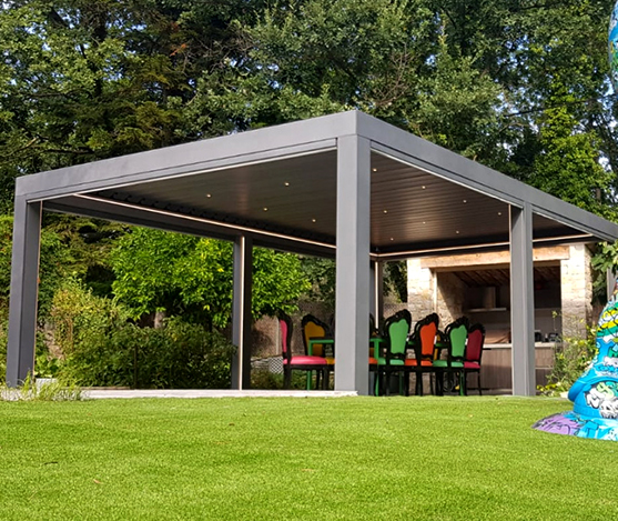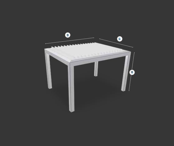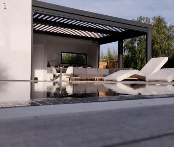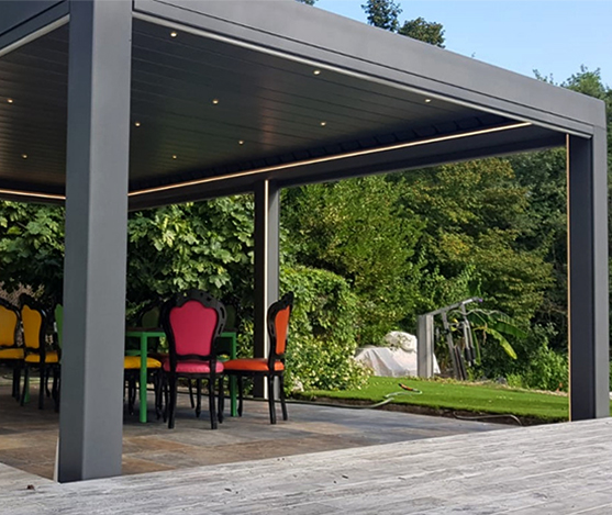 Gamme Luxe Module simple 6m Avec gouttière périmétrique double peau Lame double peau isolante > 1 moteur linéaire > 4 poteaux Module simple 8m renforcé Avec gouttière périmétrique double peau Lame double peau isolante > 2 moteurs linéaires > 6 poteaux Eclairage: Spot led intégré dans les lames & strip led gouttière et poteaux GAMME LUXE Fermetures latérale et frontale: Store zip intégré, i-glass intégré.