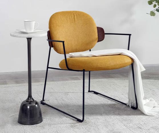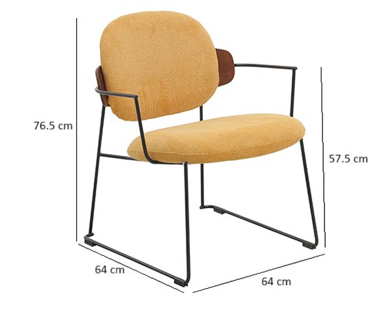 chaise repas en tissu jaune arrière dossier bois walnut sur luge en métal noire