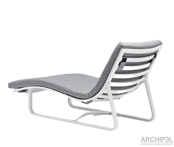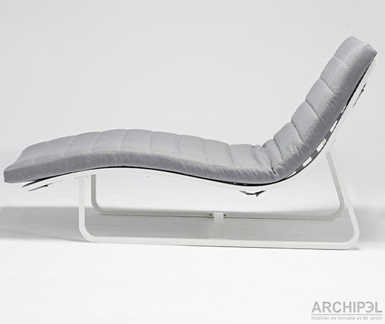 Chaise longue “FLOW” avec la structure en aluminium blanche, le matelas et le repos de la tête avec le mousse Quick Dry et tissu gris SUNPROOF.
