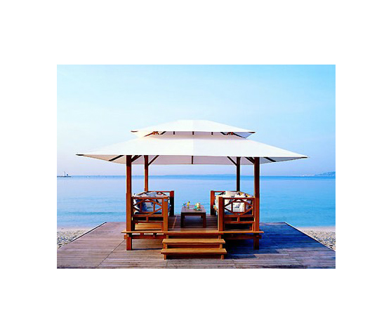 spacieux, confortable et convivial, le sunset est conçu pour accueillir jusqu’à douze convives et ses larges bancs invitent également à profiter d’une sieste isolée à l’abri de la chaleur et de l’humidité… par ailleurs, son allure permet de mettre en valeur un nouvel espace de vie dans le jardin. sa structure est en teck et sa couverture, toile de style méditerranéen, est étanche et démontable. il est livré avec bancs et table basse, matelas et coussins avec housses amovibles en tissu sunbrella®, bâche de protection et plateau d’appoint à poser sur les barrières.