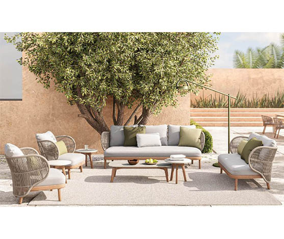 canapé jumbo 3 places structure aluminium couleur teak, rope: sand hf-006, avec coussins sand sef4008-1