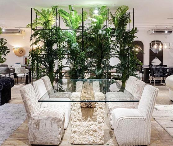 table repas brava chemin de fer bois natural avec plateau en verre 19mm / base en beton