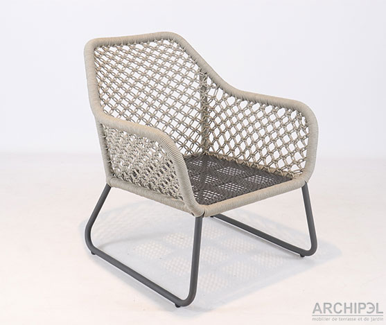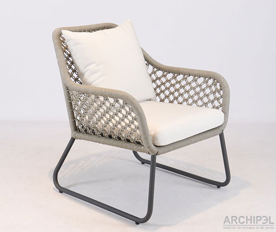 Fauteuil « MOMA » se caractérise par son revêtement en cordes tressées polyrope 6 mm beige avec la structure en aluminium CARBON MATTE, le coussin et l’assis en tissu HDF SUNBRELLA.