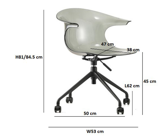 chaise en polycarbonate sur roues, coque fumée et base noire