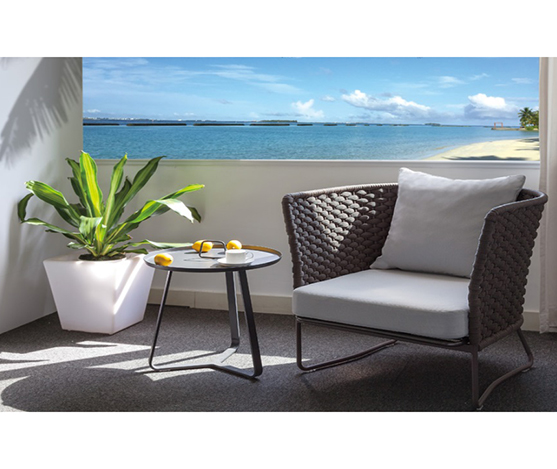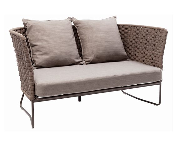 Canapé 2 places avec deux fauteuils en corde avec coussin tissu taupe.