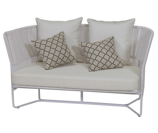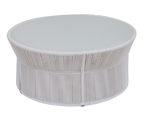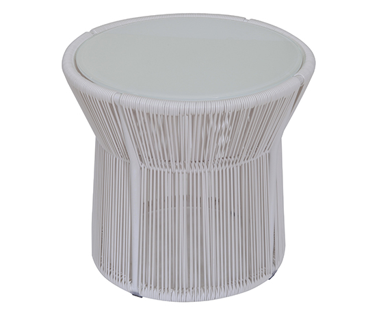 Canapé 2 places et deux fauteuils avec table basse, table d’appoint en blanc.