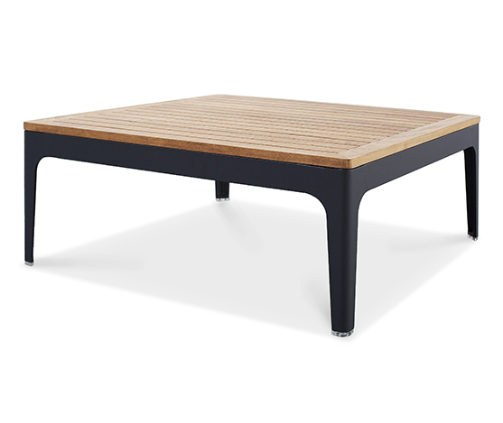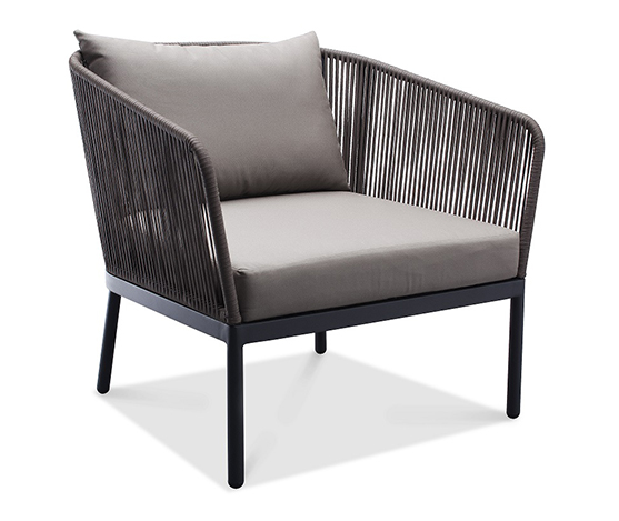 Canapé 2 places et deux fauteuils en cordage avec coussin taupe, table basse top teak structure aluminium.
