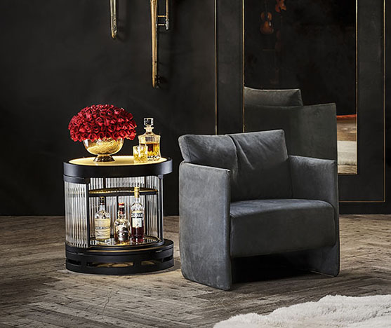 L’armoire bar est sa propre étiquette d’avertissement, mais cette belle capsule rougeoyante de tiges de verre fabriquées à la main est néanmoins tentante. Tenues dans un cadre noir, avec un éclairage led intégré dans le dessus, les portes coulissantes rondes révèlent un noyau protégé d’étagères en verre, pour contenir les bouteilles du poison préféré de vos invités.