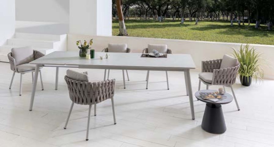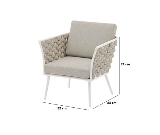 fauteuil art structure alu blanche, tissu sunproof fontelina gris avec rope 40mm