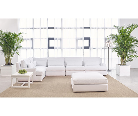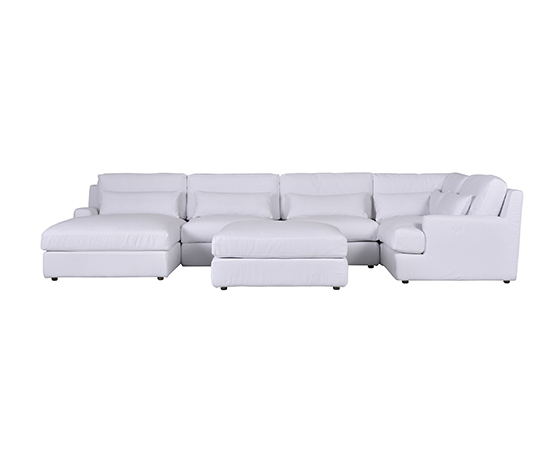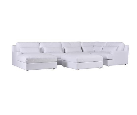 Un canapé d’inspiration shabby chic avec des coussins de banquette, un dossier mi-hauteur en bois et des coussins en Plume et fibre pour une assise somptueuse et de soutien. À une base rembourrée fixe.