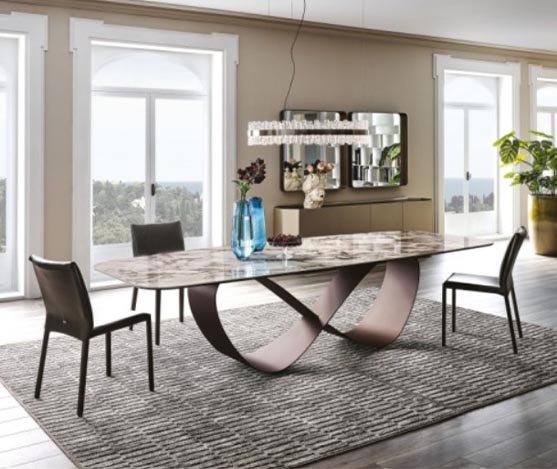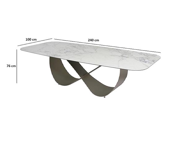 table a plateau fixe :stratifié en verre trempé ep.10mm avec céramique arabescato brillant de 6mm (fmg-001) ; cadre en métal bronzé n4